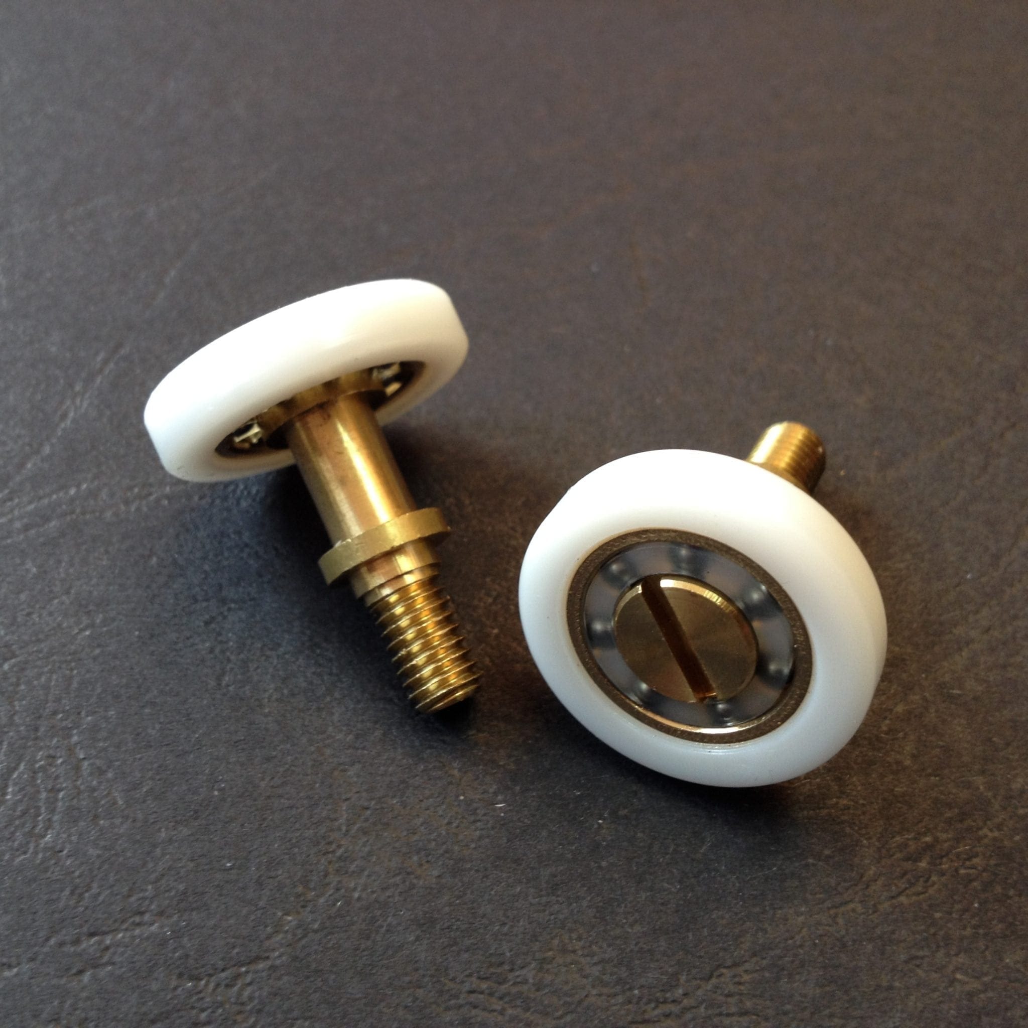 Roulette droite simple pour porte coulissante de cabine de douche. Vendue à l’unité, cette roulette se composent d’un corps en laiton. Le bandage de la roulette est en téflon, recouvrant un roulement à billes étanche en acier inoxydable. Le choix et la qualité des matériaux employés offrent une utilisation optimale de confort, limitant ainsi le frottement et le bruit lors de la manipulation de la porte.