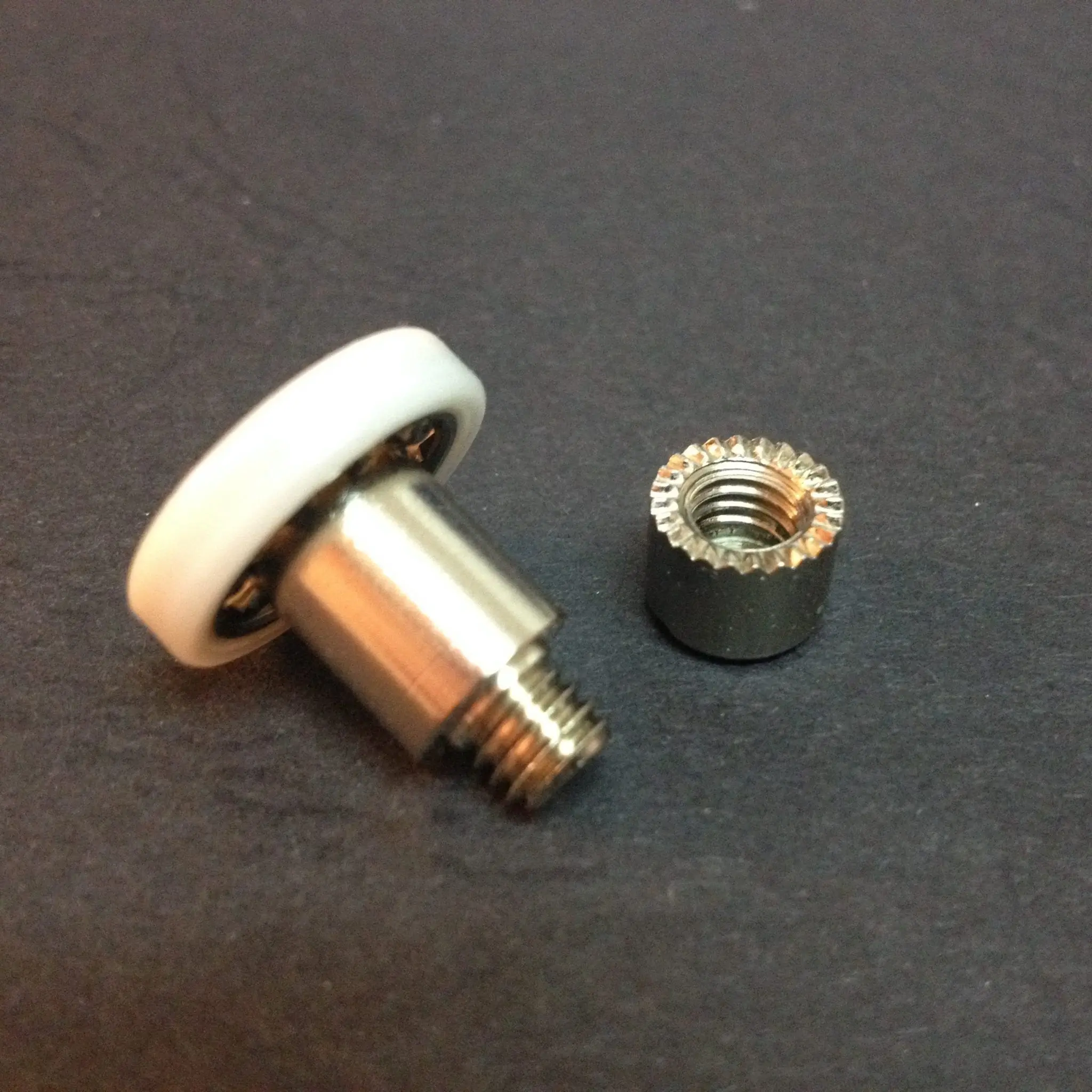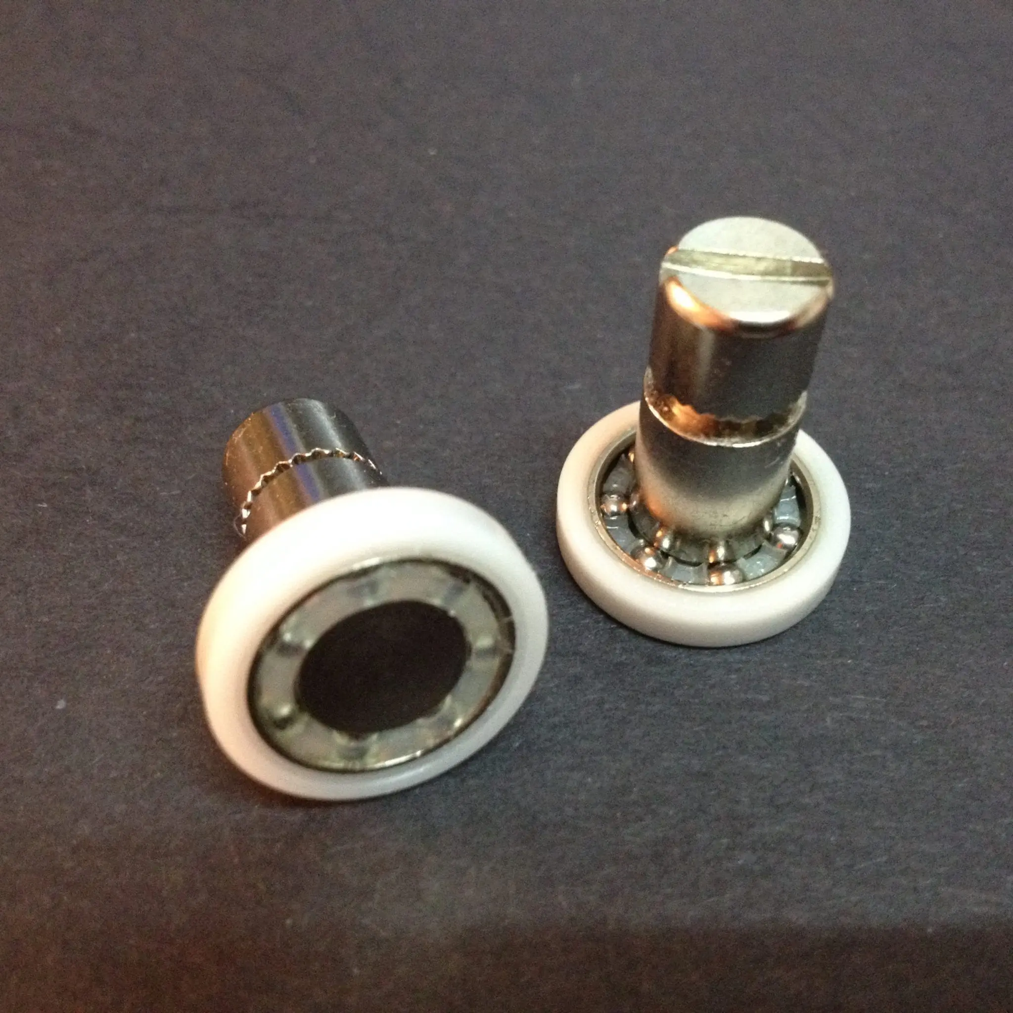 Roulette simple droite pour porte coulissante de cabine de douche. Vendue à l’unité, cette roulette se compose d’un corps en laiton. Le bandage de la roulette est en téflon, recouvrant un roulement à billes étanche en acier inoxydable. Le choix et la qualité des matériaux employés offrent une utilisation optimale de confort, limitant ainsi le frottement et le bruit lors de la manipulation de la porte.