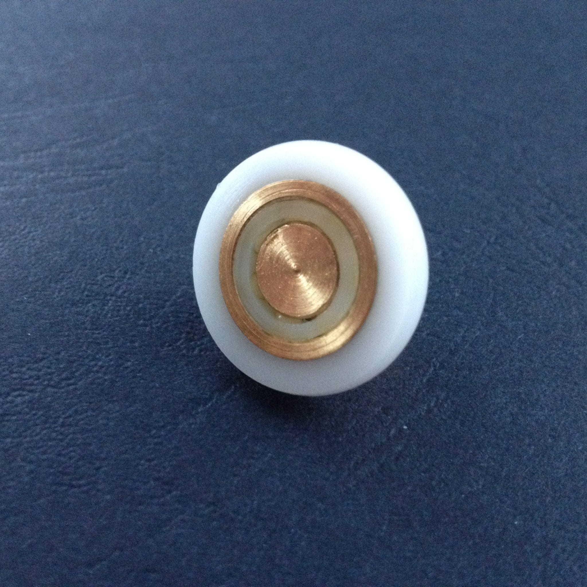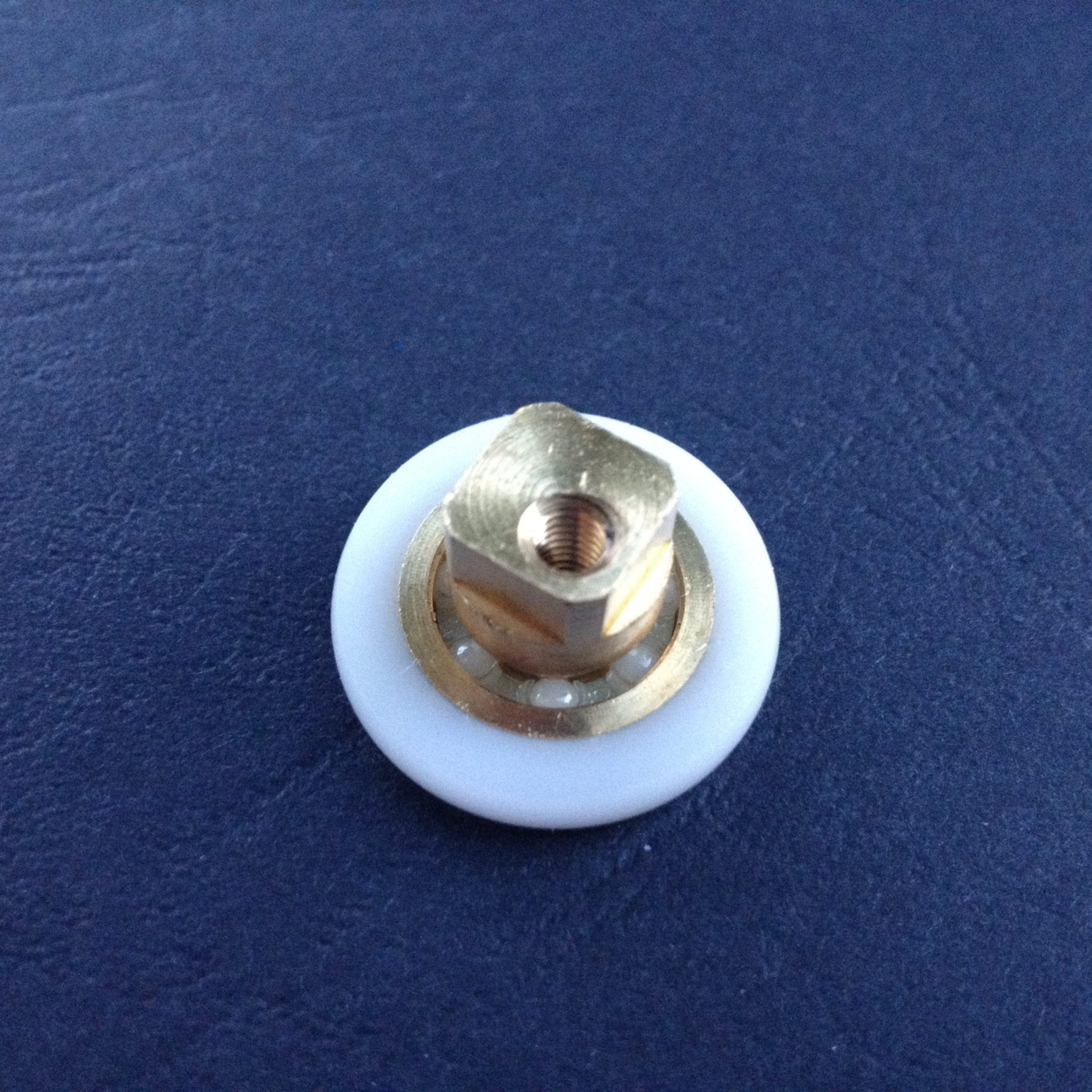 Roulette simple droite pour porte coulissante de cabine de douche. Vendue à l’unité, cette roulette se compose d’un corps en laiton. Le bandage de la roulette est en téflon, recouvrant un roulement à billes étanche en acier inoxydable. Le choix et la qualité des matériaux employés offrent une utilisation optimale de confort, limitant ainsi le frottement et le bruit lors de la manipulation de la porte.