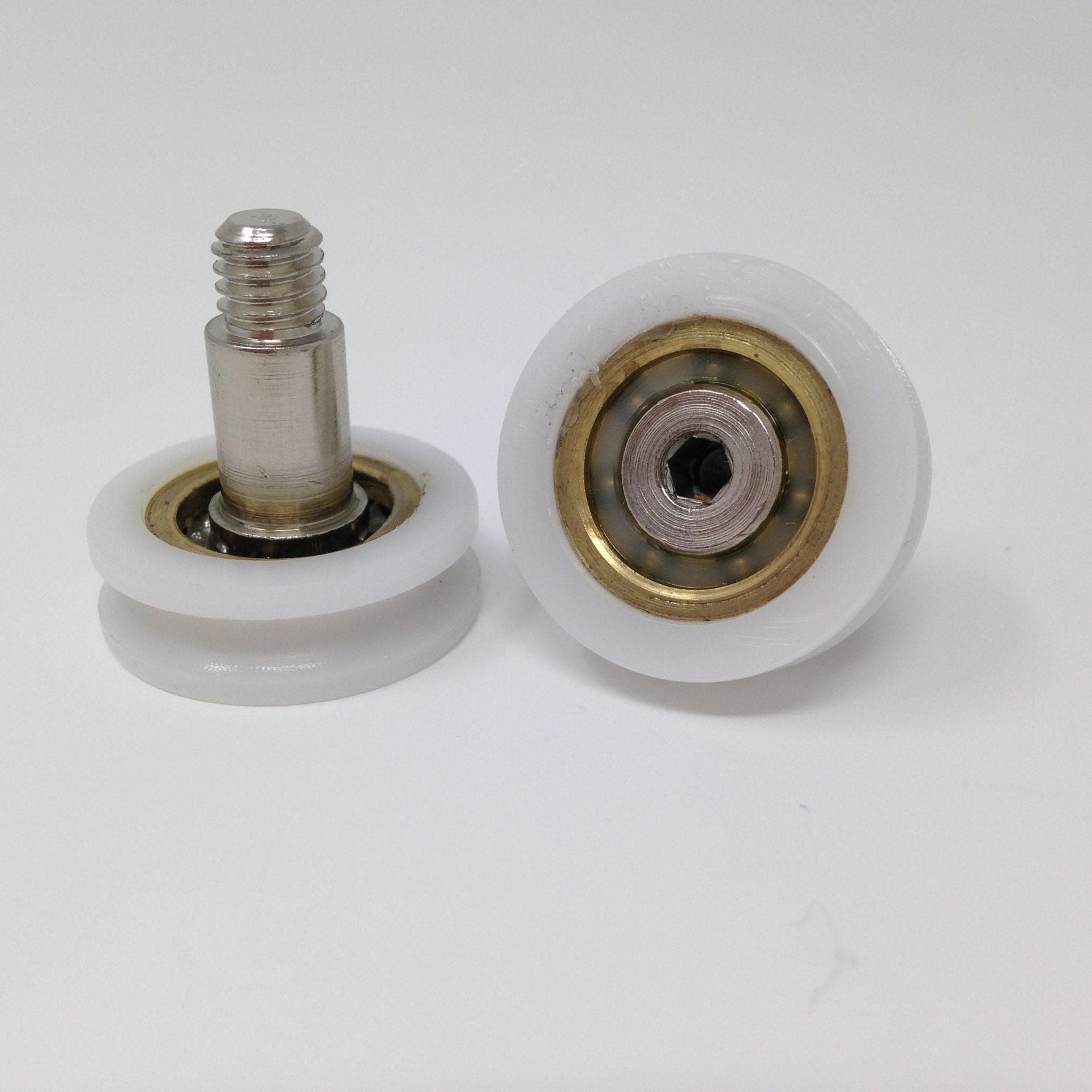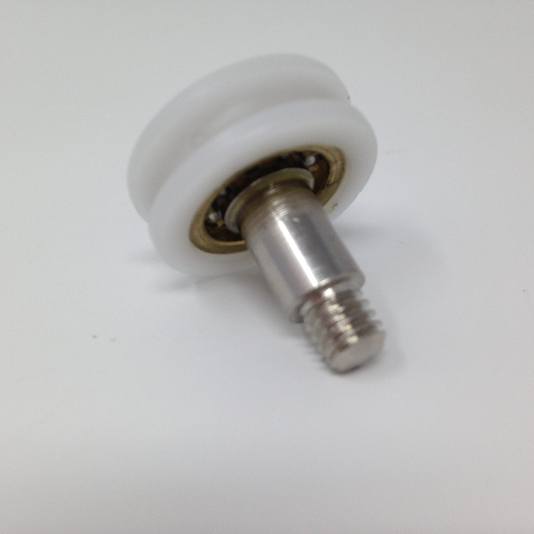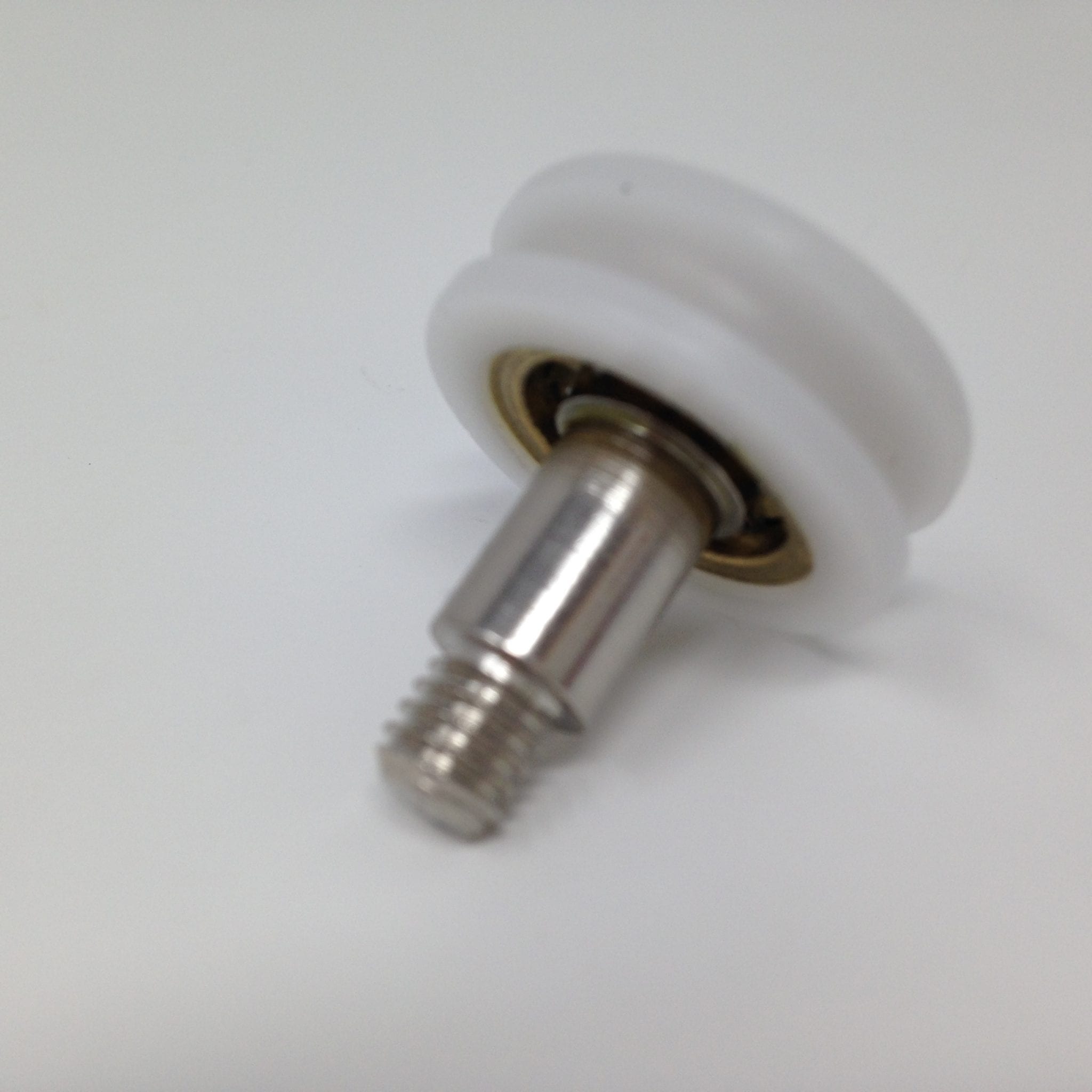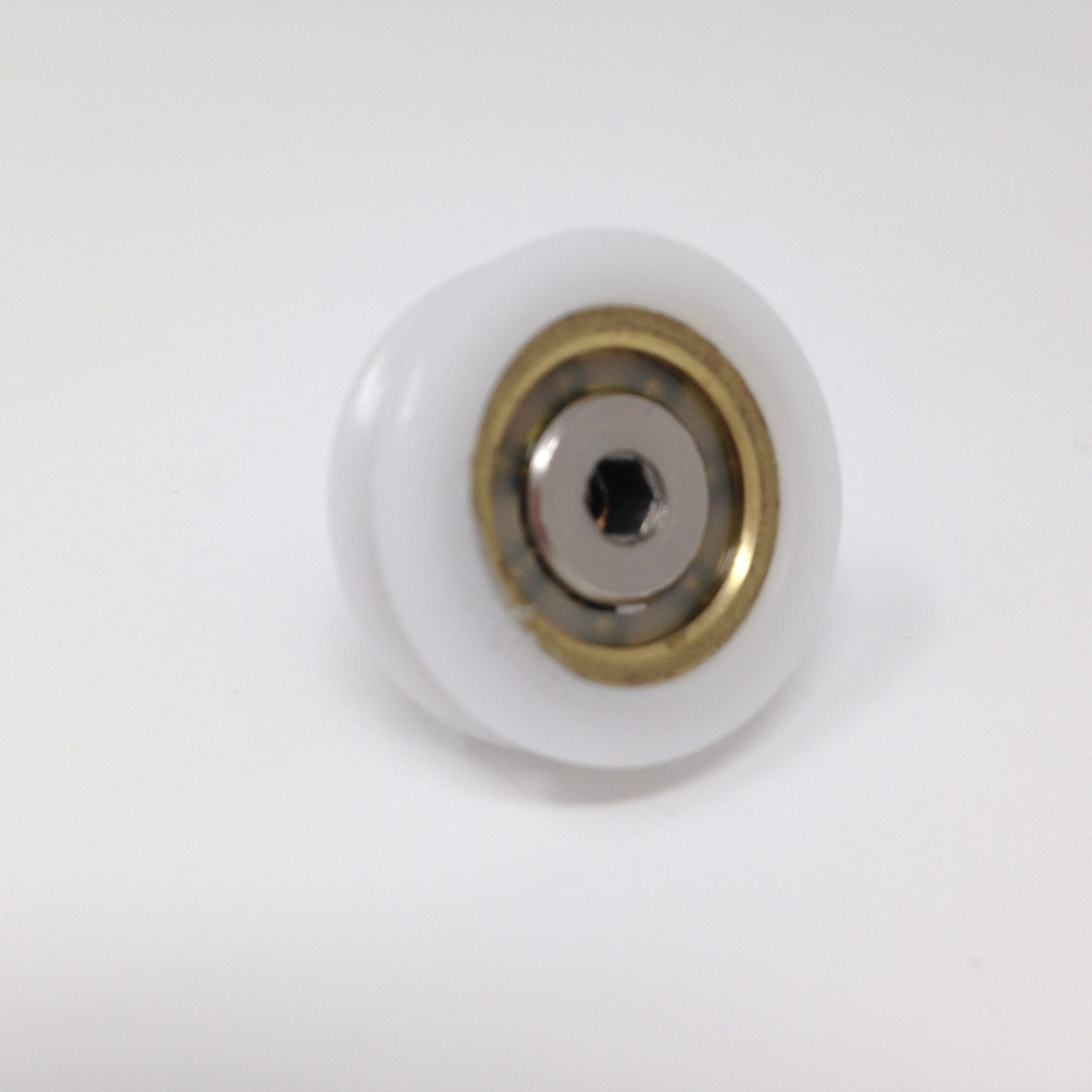 Roulette droite simple pour porte coulissante de cabine de douche. Vendue à l’unité, cette roulette se compose d’un corps en laiton. Le bandage plat de la roulette est en téflon, recouvrant un roulement à billes étanche en acier inoxydable. Le choix et la qualité des matériaux employés offrent une utilisation optimale de confort, limitant ainsi le frottement et le bruit lors de la manipulation de la porte.