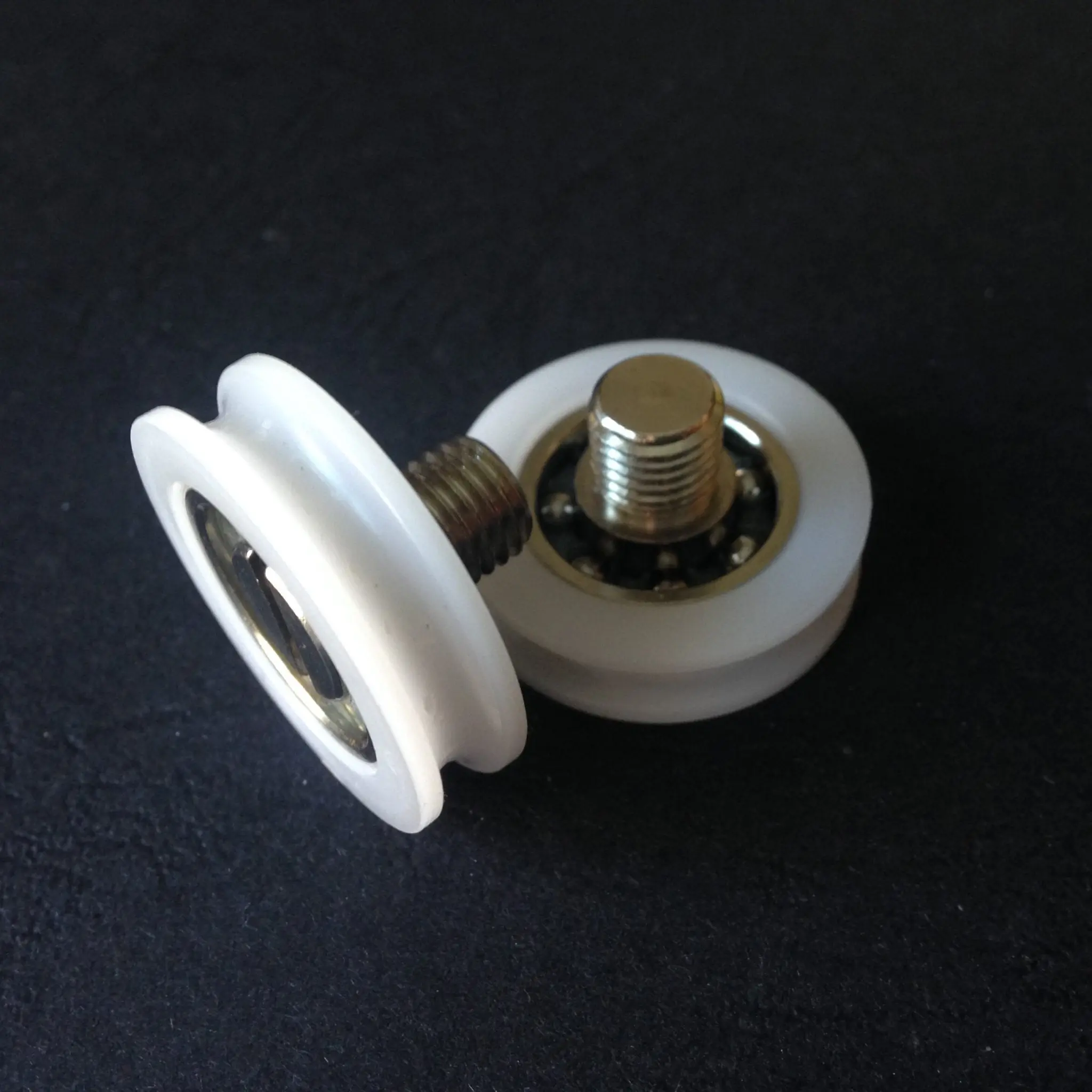 Roulette simple droite avec gorge en U pour porte coulissante de cabine de douche. Vendue par lot de 2, cette roulette se compose d’un corps en laiton. Le bandage de la roulette est en téflon, recouvrant un roulement à billes étanche en acier inoxydable. Le choix et la qualité des matériaux employés offrent une utilisation optimale de confort, limitant ainsi le frottement et le bruit lors de la manipulation de la porte.