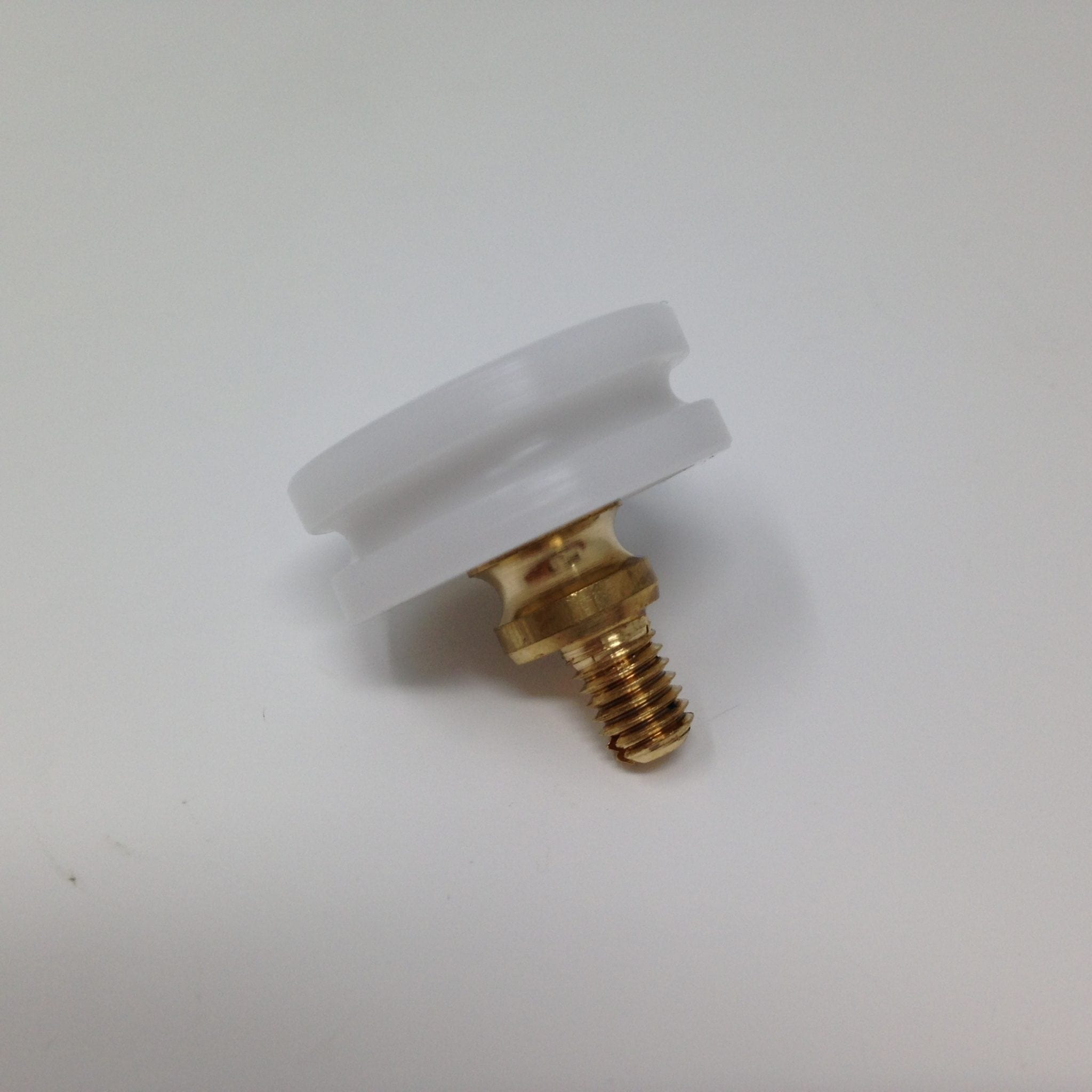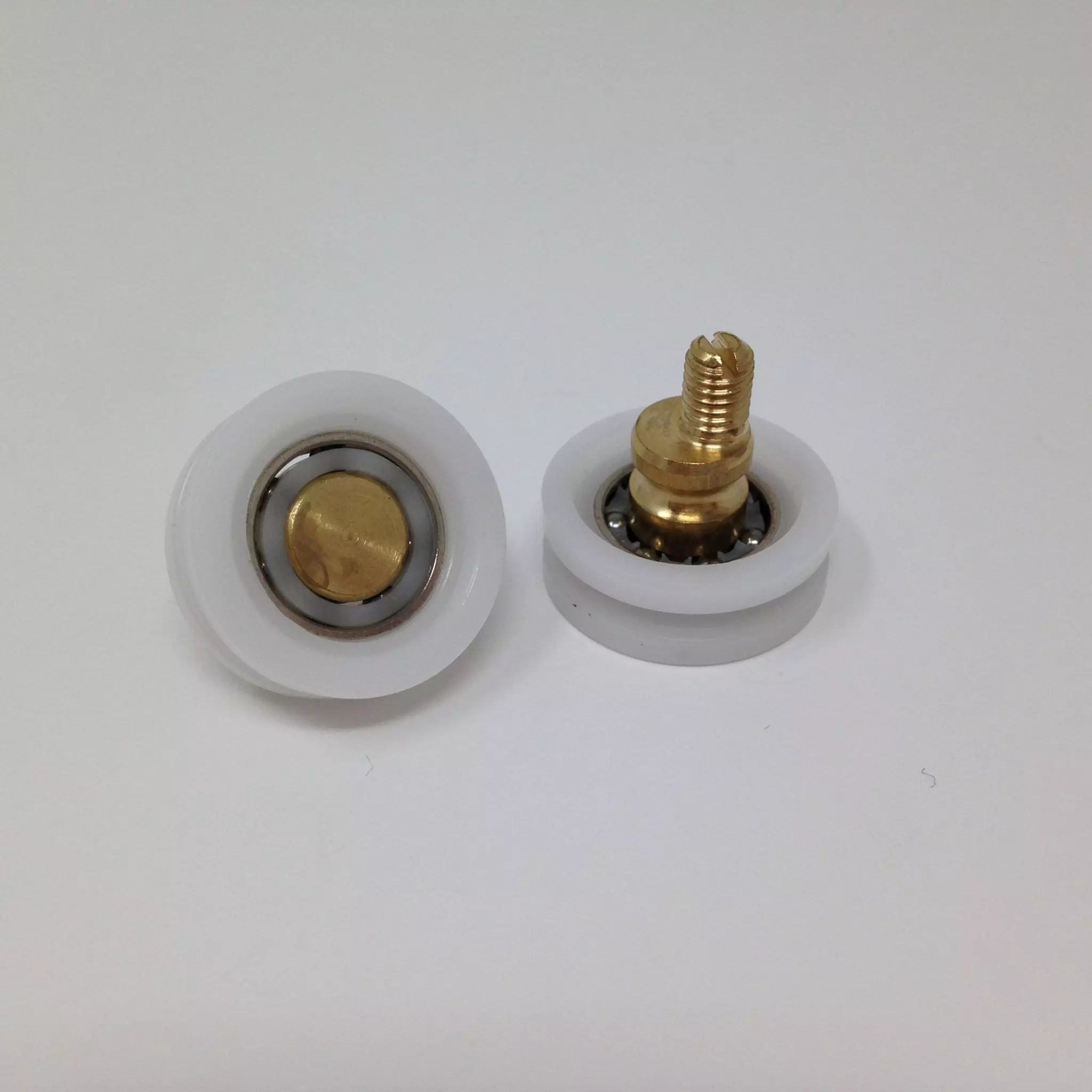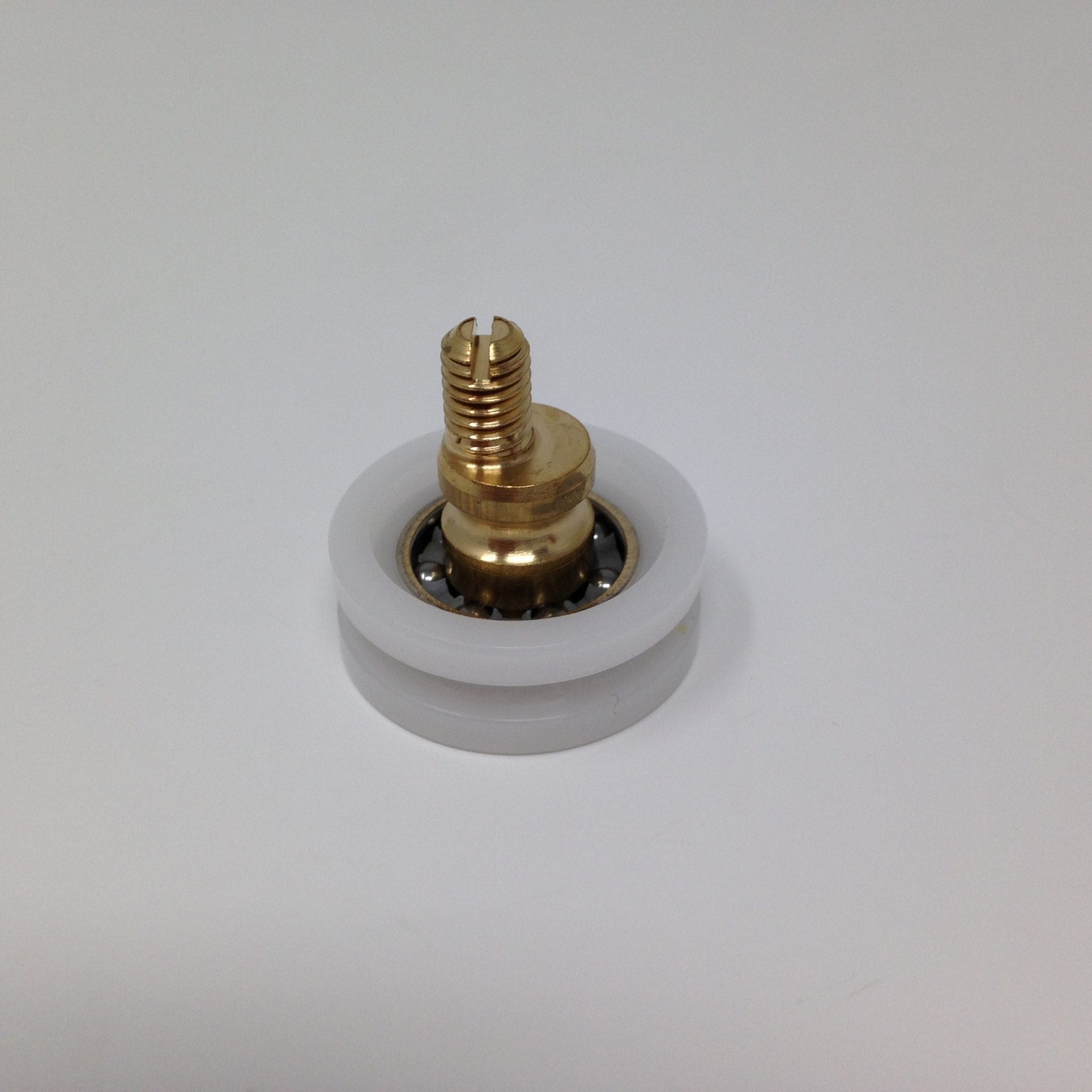 Roulette simple droite avec gorge en U pour porte coulissante de cabine de douche. Vendue à l’unité, cette roulette se compose d’un corps en laiton. Le bandage de la roulette est en téflon, recouvrant un roulement à billes étanche en acier inoxydable. Le choix et la qualité des matériaux employés offrent une utilisation optimale de confort, limitant ainsi le frottement et le bruit lors de la manipulation de la porte.